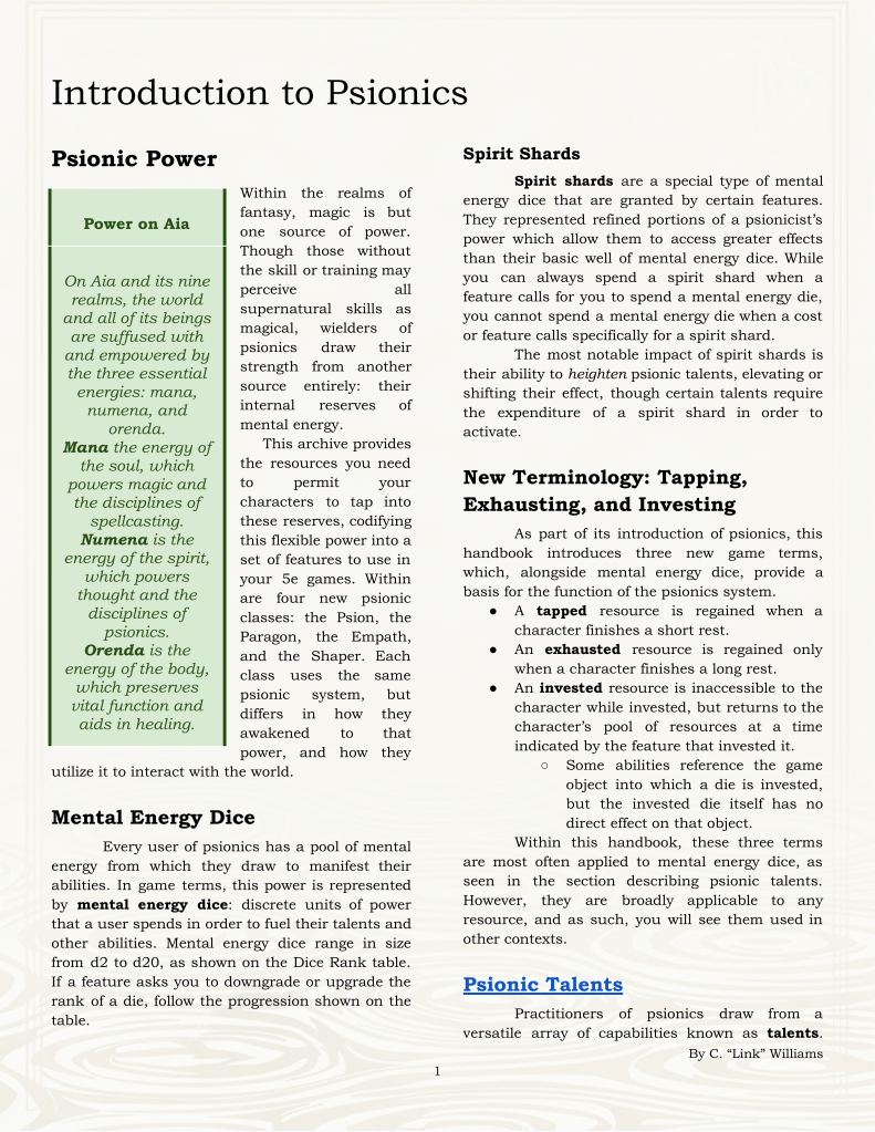 I posted a bit of a teaser a few days ago for a project on which I have spent a great deal of time: a collection of content for 5th edition focused on a system of psionics, and a collection of new classes which use that system. I return today with more content. Hopefully, this will help answer some of the questions my initial post may have raised for you.