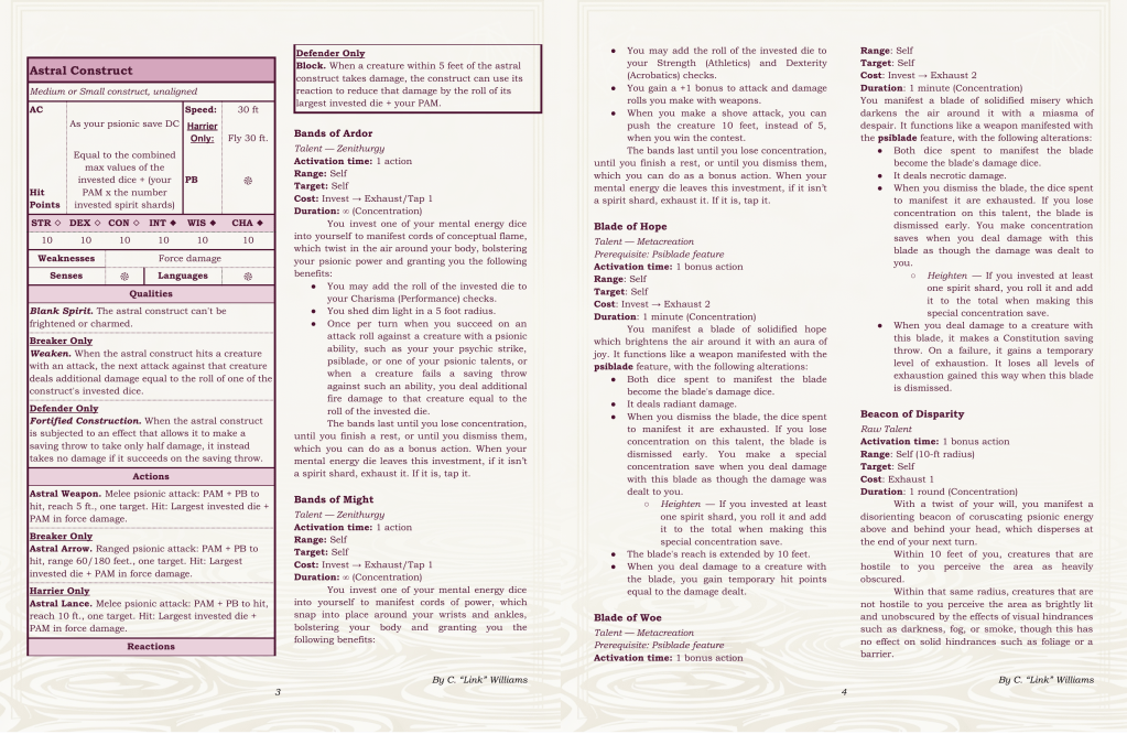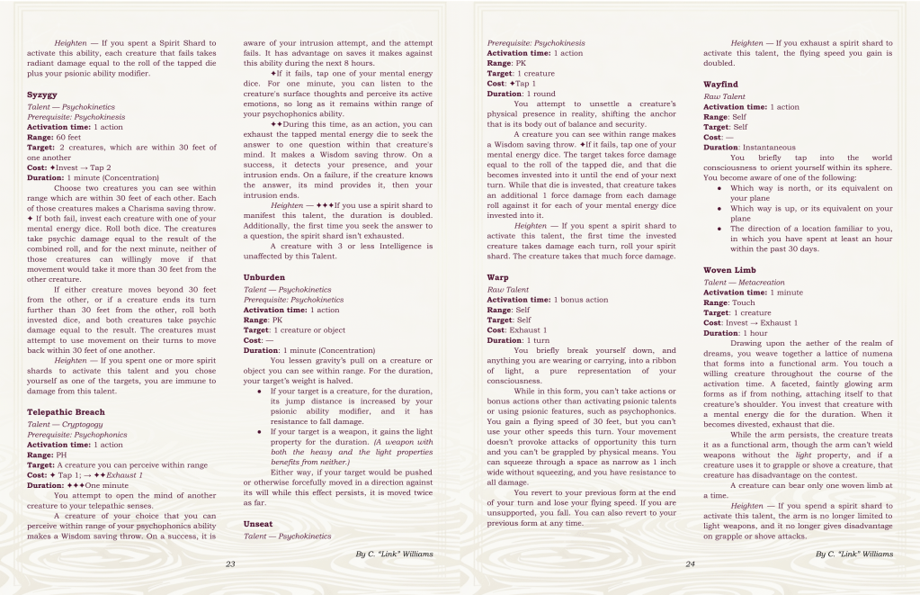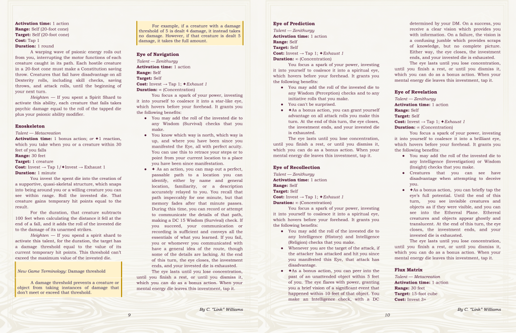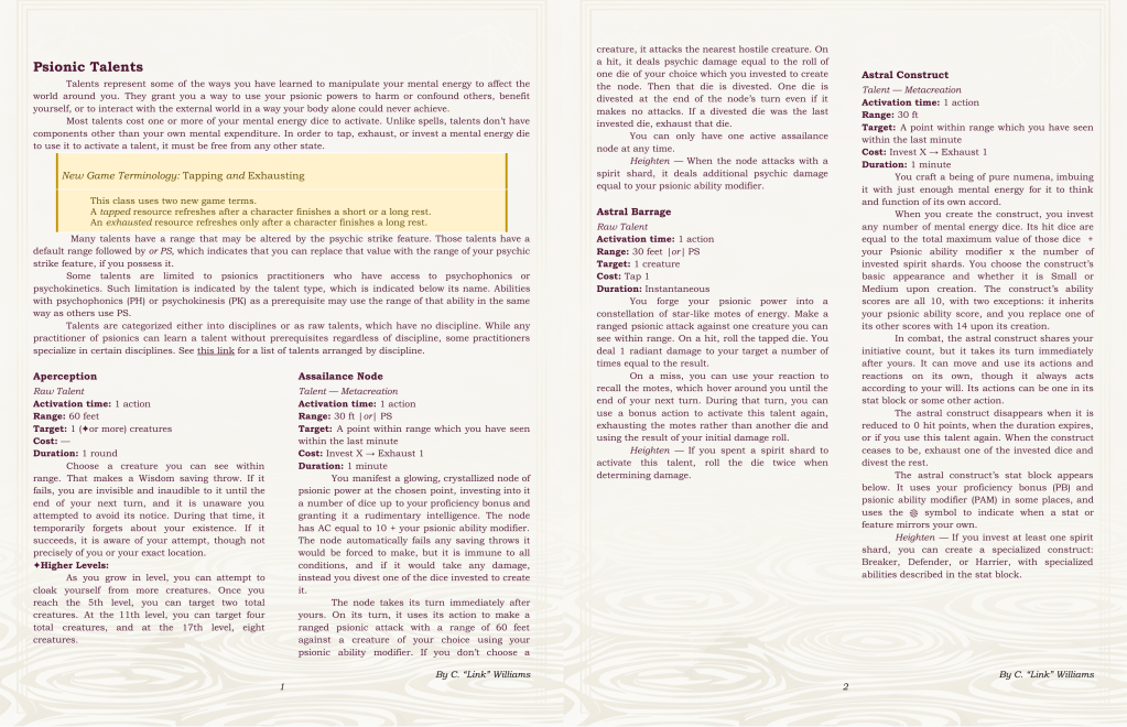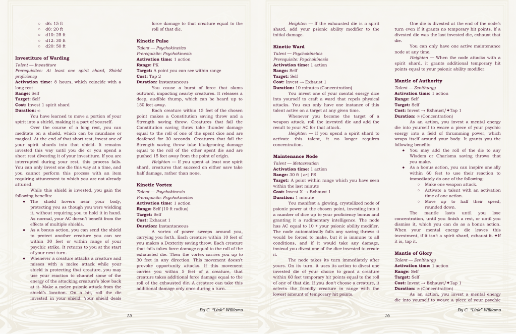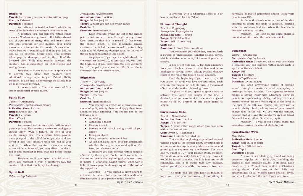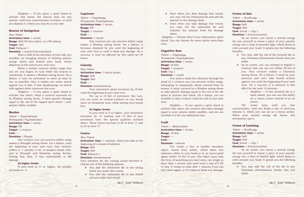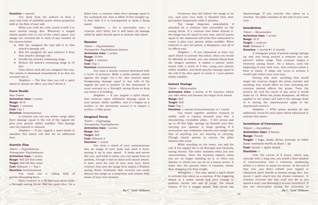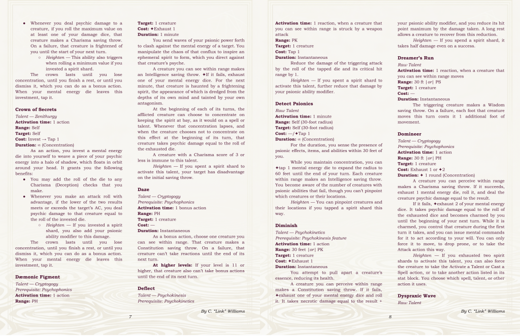 Talents are, effectively, the psionic equivalent to spells: specialized effects you can manifest by shaping the energies of your mind. This list of talents is used by the Paragon and by the other classes found in Link’s Psionic Handbook. Enjoy!